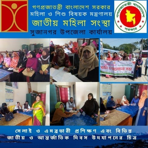বাংলাদেশের জনসংখ্যার এক বিশাল অংশ নারী ৷ নারীর উন্নয়ন তাই জাতীয় উন্নয়নের অন্যতম শর্ত । সমতায় অংশগ্রহণ ও সমতায় অংশিদারিত্ব নারীর সাংবিধানিক অধিকার ৷ জাতীয় উন্নয়ন, দারিদ্র বিমোচন ও গণতান্ত্রিক সমাজ প্রতিষ্ঠার ক্ষেত্রে নারী পুরুষের সমঅংশিদারিত্ব নিশ্চিত হওয়া জরুরী ৷ জাতীয় মহিলা সংস্থা সুজানগর উপজেলা কার্যালয় নারীর অর্থনৈতিক উন্নয়ন, সচেতনতা বৃদ্ধি, দক্ষতা উন্নয়ন ও অধিকার সংরক্ষণের মাধ্যমে নারী পুরুষের সমতা প্রতিষ্ঠা করার লক্ষ্যে কাজ করে যাচ্ছে ৷ বিগত ৩ বছরে ২৭০ জন মহিলাকে দর্জি ও এমব্রয়ডারী প্রশিক্ষণ প্রদান, দরিদ্র মহিলাদের আত্ম-কর্মসংস্থানের জন্য ১০৫ জন মহিলাকে ক্রমপুঞ্জিতভাবে ১৫ লক্ষ ৭৫ হাজার টাকা ক্ষুদ্রঋণ বিতরণ করা হয়েছে। যৌতুক ও বাল্য বিবাহ প্রতিরোধ, নারী ও শিশু প্রচার রোধ, তথ্য প্রযুক্তি ও ইন্টারনেট সেবা এবং আধুনিক যন্ত্রপাতির মাধ্যমে সময় উপযোগী প্রশিক্ষণ প্রদান কল্পে ২০টি উঠান বৈঠকের মাধ্যমে ৬০০ জন মহিলাকে সচেতন করা হয়েছে